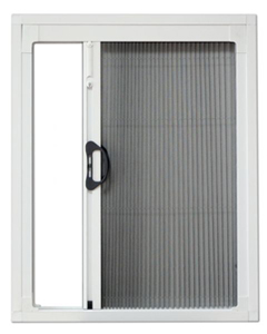 - einfacher (bis zu einer Breite von 180cm, der von der linken oder rechten Seite geschlossen wird) oder zweifacher (bis zu einer Breite von 350cm und verschließt sich gegen die Mitte) Plissee-Insektenschutz