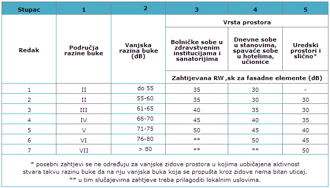 Tabela prikazuje traženi nivo zaštite od buke (prigušenja buke) za pojedini životni prostor, prema standardu DIN 4109.